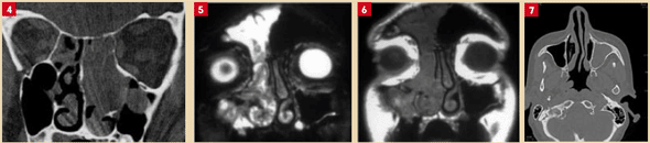 L’évaluation radiologique doit être faite hors période de surinfection et, si possible, avant toute corticothérapie générale. Dans les formes précoces, l’examen normal peut être trompeur, mais la présence d’opacités bilatérales des cellules ethmoïdales oriente vers une ethmoïdite chronique. L’hyperéosinophilie des sécrétions nasales, en l’absence d’allergie, évoque une rhinite non allergique avec éosinophilie (NARES) ou une ethmoïdite éosinophile chronique.